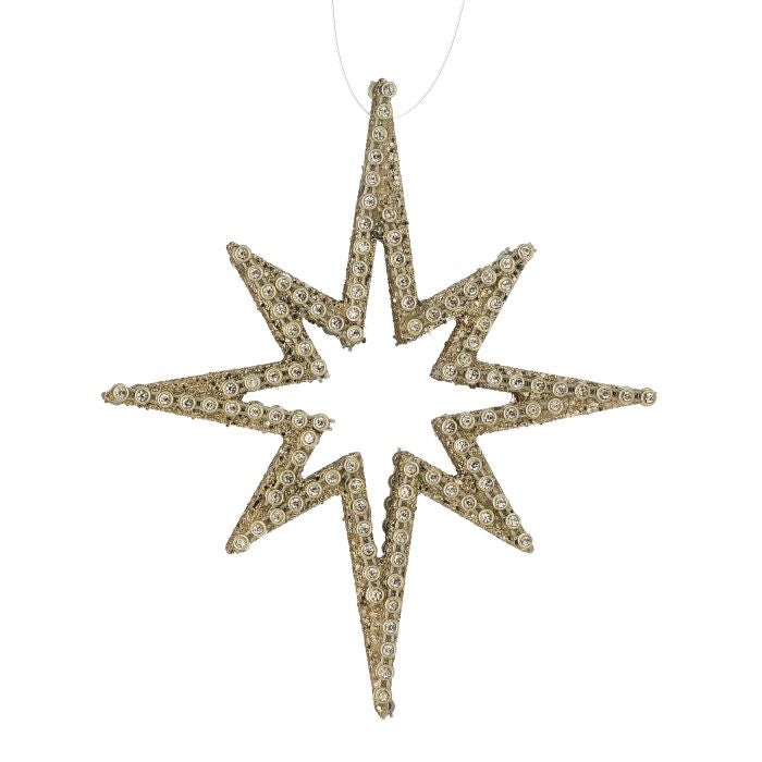 A jeweled beaded star ornament that adds sparkle and dimension to elegant tree designs.