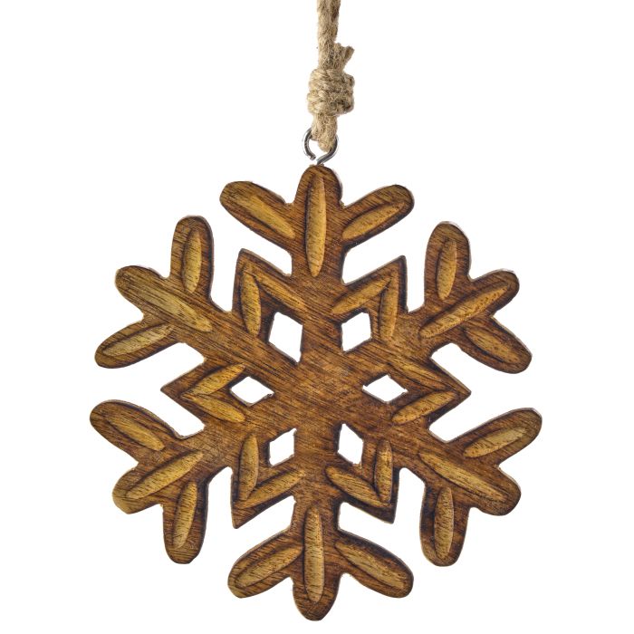 Carved from mango wood, this snowflake ornament brings natural warmth to modern rustic décor.