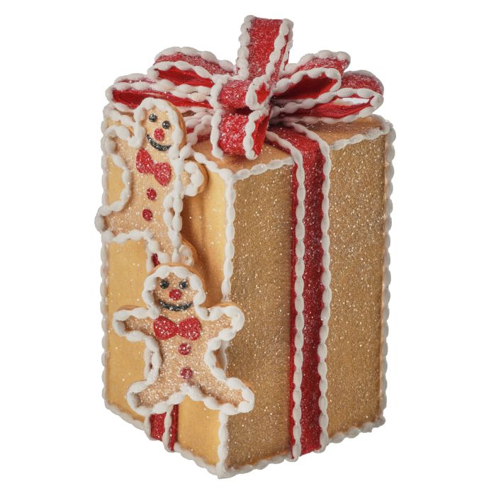 A generous, candy‑striped gift box ornament with gingerbread accents—an instant focal point on larger trees.